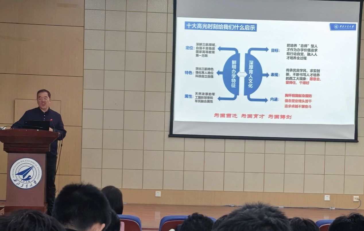 陈建有系统梳理了西工大人服务国家重大战略需求的辉煌历程,生动展现了学校扎根国防事业、践行“为党育英才、为国铸重器”使命担当的深厚底蕴。从抗战烽火中点亮救国理想的“古路坝灯火”,到国庆阅兵等重大任务里闪耀的“西工大身影”;从师昌绪、陈士橹、康继昌等先辈的开拓精神,到如今重大型号总师校友辈出的“西工大现象”,再到聚焦“总师型”人才培养的育人实践——每一段历程都将育人内核与校史校情深度交融。生动的讲述让在座各位同学对总师育人文化的历史和文化逻辑有了更加深刻的理解。
