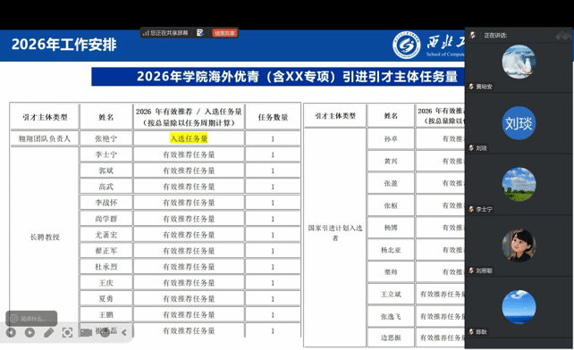 尚学群全面回顾了2025年学院人才引进工作的整体情况,围绕海外引才项目进行全面详解。为使参会人员清晰掌握引才政策要求,重点解读了“海外优青”项目的申报条件、待遇支持及学院个性化激励政策,为后续引才工作开展筑牢基础。在复盘 2025 年引才成效基础上明确了学院2026年海外优青等项目的引才任务、策略及路径。她指出,学院将坚持以目标牵引、强化激励为导向,充分调动各团队引才积极性。同时为进一步发挥“以才引才”实效,凝聚全员引才合力,学院参照聘期任务逐一对承担引才任务的国字号人才、 荣誉学衔专家、长聘教授、翱翔人才等引才主体下达了任务指标,要求各团队锚定目标、精准发力,确保年度目标圆满完成。