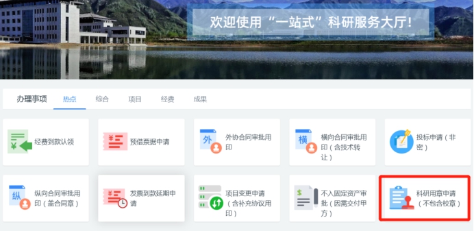 2. 办理地址:登录翱翔门户,点击“科研系统”进入系统bwin必赢首页;在bwin必赢首页办理事项栏选择“科研用章申请”。